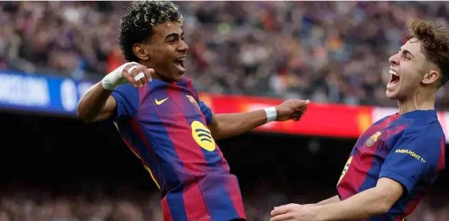 比赛第28分钟,巴萨发动快速反击,亚马尔灵巧突破防守,在禁区内左脚斜射,将球稳稳送入网窝,为主队先拔头筹。紧接着第37分钟,他在禁区外右侧持球时,突破两名防守球员后毫不犹豫地左脚怒射,一记力量与精准兼备的超级世界波让所有观众叹为观止。